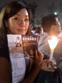 去年二十週年六四燭光集會的報導感動了我。上Youtube知道了「六四」是怎樣一回事,了解加深。今年是我二十一年以來笫一次參與燭光集會。親身睇驗感覺很震撼!在球場上的每一個人都令我好感動。最深刻的是坐我前面的一對老公公老婆婆。老公公推著坐輪椅的老婆婆到場支持,幾小時的集會中一直照顧老伴。我完全感受到他們對平反六四的堅持!身後的一班年青人也不是來鬧玩的。看樣子89年他們應該還未出世吧!但一班90後有秩序的也安靜地參與,還一起高聲響亮地高唱二十一年前的民運歌曲。我可以安心了。因為他們使我肯定六四的精神會薪火相傳! 在場所有燃點的燭光紀念著每個為民主而犧牲的死難者,也為他們在國內不能公開祭拜的家人燃點。有幸與十五萬人一同見證歷史,我們不會忘記!